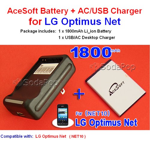 New AceSoft 1800 mAh L45C Optimus Net Battery Wall/Travel/Home/Dock/Desktop/USB Charger FOR LG Optimus Net L45C (NET10) SmartPhone USA
