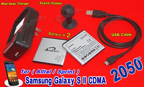 NEW 2x 2050mAh AceSoft Battery+USB/AC Travel Home Wall Dock Desktop Charger+Micro USB Data Sync Cable+Stand Holder for Alltel / Sprint Samsung Galaxy S II s2 CDMA Smart Phone Accessory