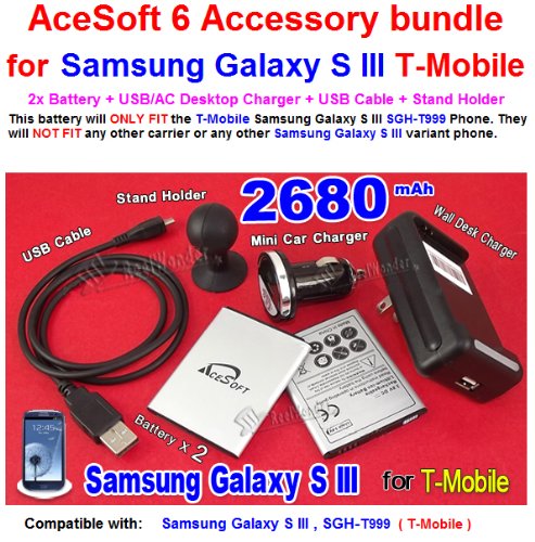 6IN1 2 AceSoft 2680mAh Extra Battery Wall AC/USB Home Desktop Travel Dock Charger Mini USB Car Charger Micro USB Data Sync Cable Stand Holder For T-Mobile Samsung Galaxy S III s3 t999 T 999 Smart Phone